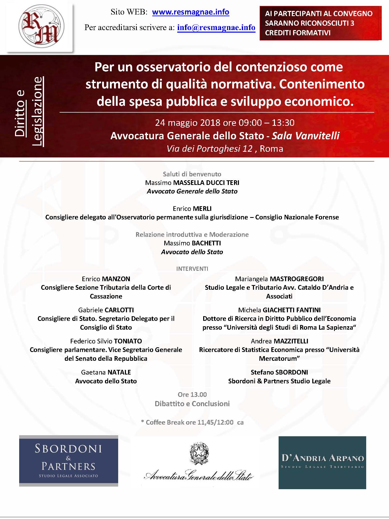 Si sta tenendo questa mattina presso l’avvocatura generale dello Stato il convegno “Per un osservatorio del contenzioso come strumento di qualità normativa. Contenimento della spesa pubblica e sviluppo economico”, che verrà introdotto da Massimo Massella Ducci Teri, avvocato generale dello Stato, Enrico Merli, consigliere delegato dell’Osservatorio sulla giurisdizione – Consiglio Nazionale Forense e Massimo Bachetti, avvocato dello Stato. Interviene anche l’avvocato Sbordoni, dello Studio Legale Sbordoni & Partners. lp/AGIMEG