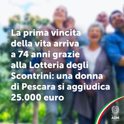 Nei giorni scorsi una pensionata di 74 anni si è presentata presso la sede ADM di Pescara per reclamare la vincita di 25.000 euro relativa al premio settimanale della Lotteria degli Scontrini.