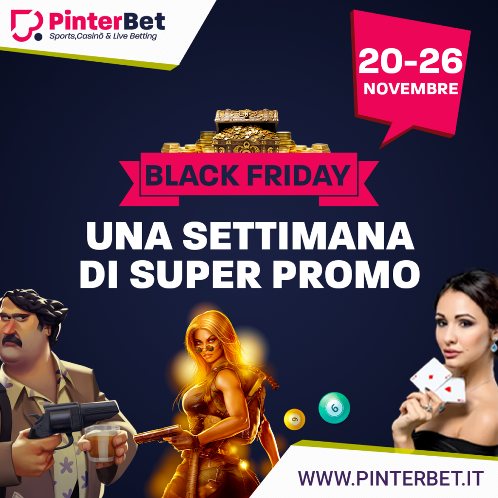 Una settimana di promozioni e divertimento. Il Black Friday in casa PinterBet si vive con gioia e spensieratezza. Ogni giorno bonus e nuove opportunità per il Casinò, Lotterie e Live. Ecco il ricco calendario offerto dal sito di gaming on line che aumenta l’offerta a 360° per gli amanti di sport, casinò e lotterie. Ecco le promozioni che iniziano il 20 e finiranno il 26 novembre.