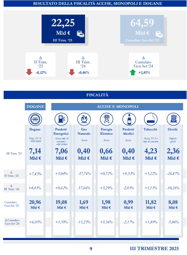 Il terzo trimestre 2025 registra un gettito per l’erario di circa 22,25 miliardi di euro, dato in calo dello 0,46% rispetto al risultato registrato nello stesso periodo del 2024.
