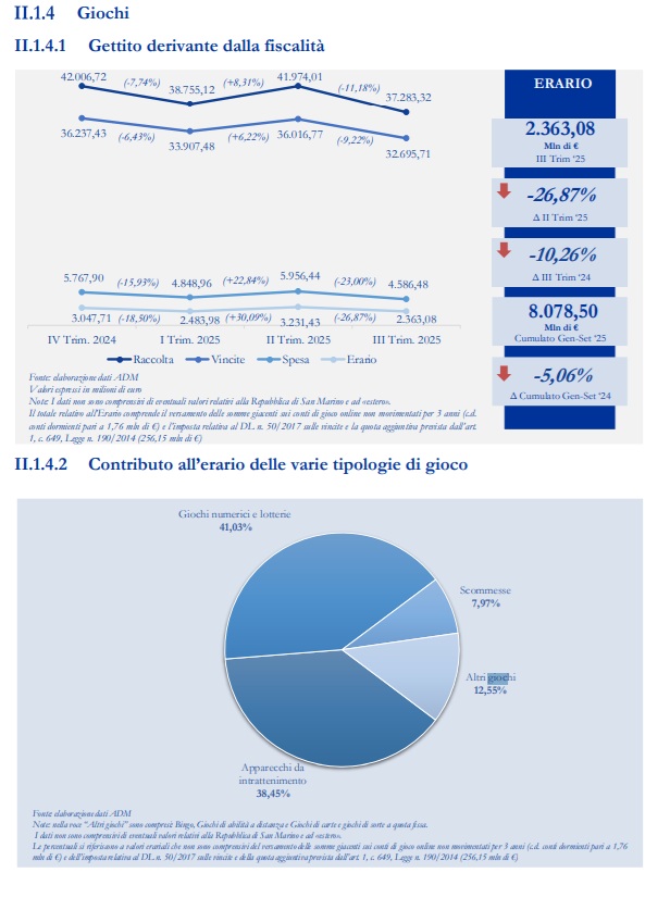 I settori Tabacchi e Giochi hanno contribuito al gettito dell’erario per rispettivamente 4,23 miliardi (+1,13% rispetto allo stesso periodo del 2024) e 2,36 miliardi (-10,26% rispetto allo stesso periodo del 2024). Il cumulato gennaio-settembre 2025 per i tabacchi è pari a 11,82 miliardi, per i giochi a 8,08 miliardi.