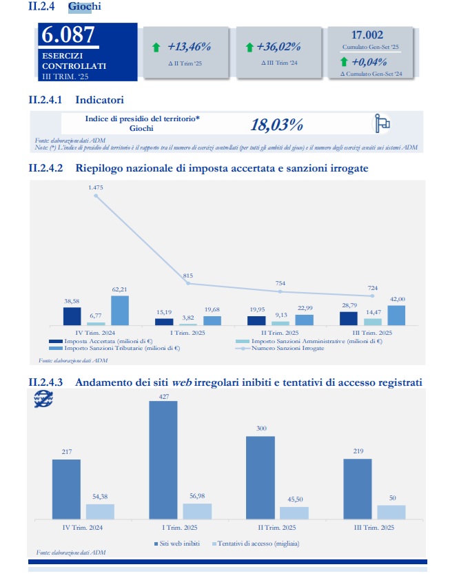 Gli esercizi controllati nel settore giochi sono stati 6.087 (+36,02% rispetto allo stesso periodo del 2024). L’indice di presidio del territorio è pari al 18,03%.