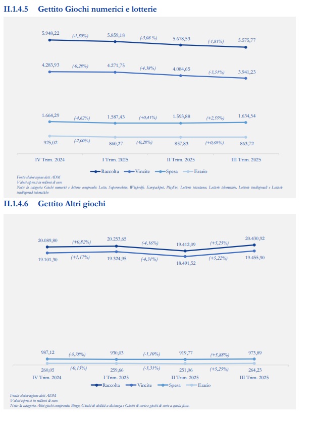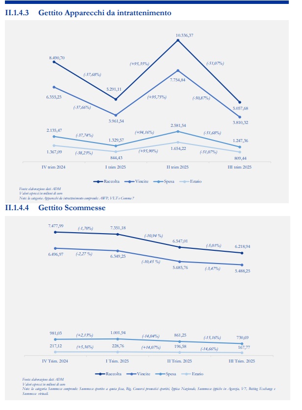 Nello specifico gli apparecchi hanno portato nelle casse dell’Erario 809,44 milioni di euro nel terzo trimestre 2025, registrando una spesa di 1.247,36 milioni e vincite per 3.810,32 milioni. Le scommesse hanno portato nelle casse dell’Erario 167,77 milioni di euro, registrando una spesa di 730,69 milioni e vincite per 5.488,25 milioni.