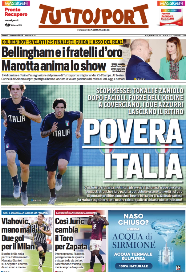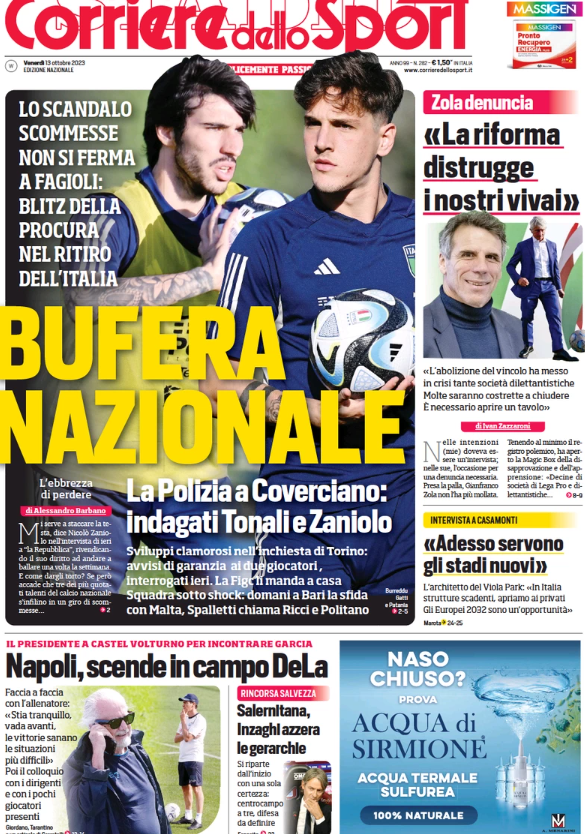La vicenda delle scommesse illegali che coinvolge, per ora, i calciatori Fagioli, Tonali e Zaniolo è diventato ormai tra gli argomenti più caldi in Italia. Anche le maggiori testate nazionali, sportive e non solo, dedicano quindi ampio spazio alla vicenda sulle prime pagine.