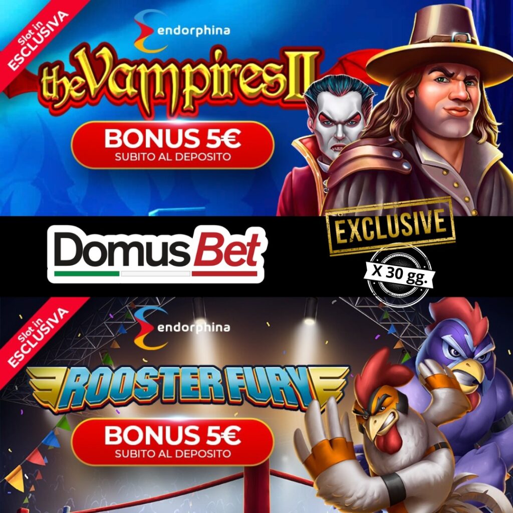 Arrivano The Vampires II e Rooster Fury le 2 nuove slot firmate Endorphina che per i primi 30 giorni a partire dal 30 gennaio 2024, saranno disponibili in esclusiva nel casinò online di Domusbet. Le 2 nuove slot prevedono delle puntate minime rispettivamente da 0,10 € e 0,05 € e in occasione di questo importante lancio Domusbet ha studiato un bonus per entrambi i giochi che prevede 5 € di fun bonus effettuando un deposito di almeno 10 €.