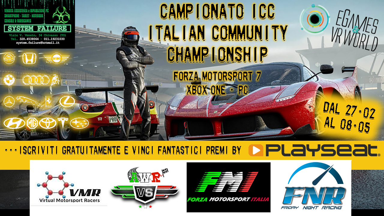 Al via oggi, mercoledì 17 maggio il primo appuntamento del Campionato ICC (Italian Community Championship), organizzato da ASD Egames & VR World in collaborazione con le più grandi community Facebook, dedicato al titolo Microsoft e Turn 10 per PC ed Xbox One. ICC è un campionato che vede 64 piloti divisi in 3 Leghe sfidarsi su otto circuiti e con 8 auto stock diverse per incoronare il primo campione italiano delle community. L’iniziativa, vista la sua importanza, è stata seguita con interesse anche da Playseat che ha sponsorizzato l’evento ed ha messo a disposizione del primo classificato una postazione di guida professional. I prossimi appuntamenti ci saranno martedì 24 aprile e mercoledì 8 maggio. La classifica generale vede al comando, al momento, VMR Karmin che ha distaccato, anche se di poco il rivale TX3 Tiltanium seguito a ruota da Resborg69. Tra gli altri organizzatori dell’evento non si possono non menzionare System Failure – sponsor tecnico di Egames & VR World – oltre che, come detto, le community Facebook dedicate a Forza Motorsport 7: Forza Motorsport Italia (FMI), VMR, FNR ed AWR. Ogni gran premio può essere seguito via Mixer e Twitch grazie agli streamer che permettono a decine di spettatori di assistere a tutte le gare. Per non perdersi nulla di questo spettacolare evento, guardate questa pagina mentre per la classifica generale andate qui. Ed ecco, infine, i link per seguire le dirette ogni mercoledì sera. mo/AGIMEG