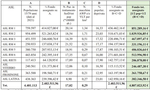 “Con il Fondo sanitario nazionale del 2023 è stata stanziata, per il gioco d’azzardo, la somma di 50 milioni. Alla Regione Lazio è stata assegnata la somma di 4.807.023,92. Con determinazione della Direzione Inclusione Sociale n. G17501 del 27 dicembre, pubblicata sul BURL n. 6 del 18 gennaio 2024, la Regione ha provveduto a ripartire l’intera somma tra le Aziende Sanitarie Locali. Il piano di riparto, come specificato nella determinazione, non tiene conto soltanto del dato relativo alla numerosità della popolazione ma prende altresì in considerazione altri indicatori come, ad esempio, la numerosità dei soggetti in trattamento presso i servizi territoriali, il dato relativo alla “deprivazione sociale” ed anche l’esposizione al rischio in termini di numero di apparecchi AWP e VLT per chilometro quadrato. A questo proposito sarebbe stato più opportuno che il parametro utilizzato non fosse solo quello relativo agli apparecchi, ma anche alla presenza di altre tipologie di giochi, a cominciare da dalle lotterie istantanee”.