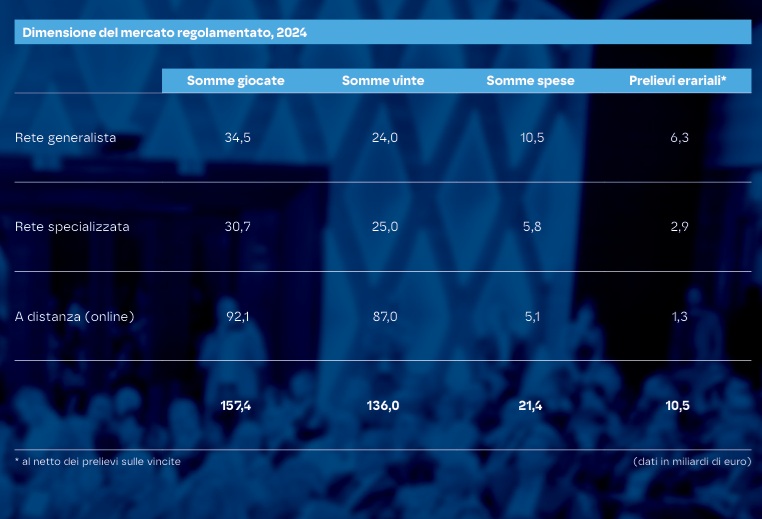 Il mercato regolamentato gestito all’interno di concessioni statali ha registrato nel 2024 oltre 157 miliardi di euro di giocate, restituendone 136 in vincite. La dimensione effettiva del mercato in termini economici è stata pertanto di 21,4 miliardi di euro, dei quali 10,5 (19%) destinati all’erario in forza dei differenti sistemi di imposizione fiscale sulle attività di gioco (al netto dei diversi prelievi sulle vincite dei giocatori); in confronto al 2023 la raccolta complessiva è aumentata di quasi il 7%, a fronte di un aumento della spesa di oltre il 2%, generando tuttavia una riduzione dei prelievi sui giochi di circa il 4% in ragione dei differenti modelli fiscali attualmente adottati. Rispetto ad una spesa del 49,1%, i prelievi erariali nella Rete generalista sono stati pari al 60%. Nell’Online a fronte di una spesa del 23,8% i prelievi erariali sono stati il 12,4%. Nelle sale specializzate le somme spese sono state il 27,1%, le entrate erariali sono state il 27,6%.