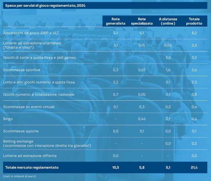 La ripartizione della spesa dei giocatori nel 2024 è stata generata per il 76% nei punti vendita, nei quali, rispettivamente, gli apparecchi da gioco AWP e VLT hanno contribuito per il 38% della spesa totale, i giochi numerici (Lotto, Superenalotto e giochi accessori) e le lotterie differite e istantanee (“Gratta e Vinci”) per il 29% e gli altri prodotti di gioco (scommesse e gioco del bingo) per il 9%. Nel gioco online, i giochi da casinò (slot machines e poker online) hanno generato circa il 14% della spesa totale del mercato regolamentato, le scommesse sportive, ippiche e virtuali oltre l’8,5%, le lotterie ed il bingo online circa l’1%.