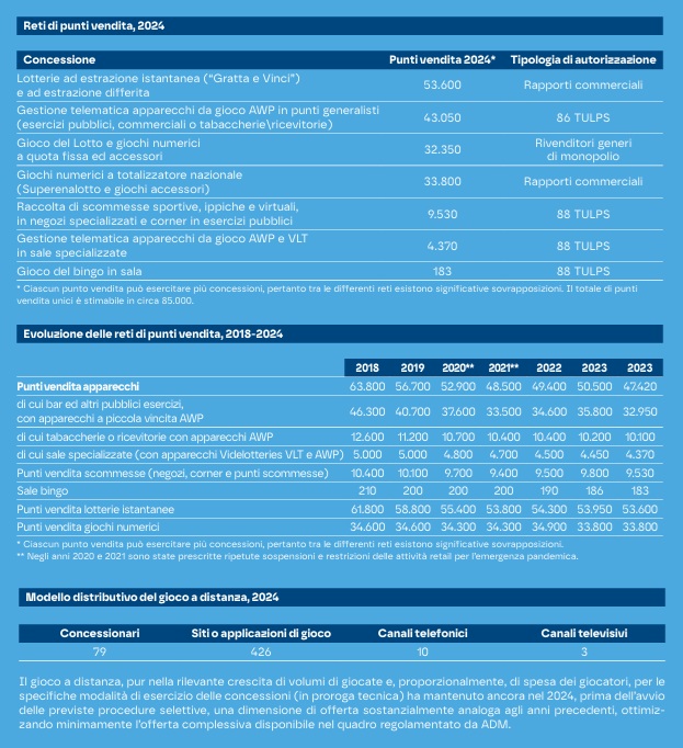 Al 2024 la rete più estesa è risultata essere quella dei punti vendita lotterie (Gratta e Vinci e lotterie nazionali) con quasi 54.000 punti vendita unici, seguita da quella dei punti con apparecchi AWP (circa 43.000), giochi numerici (Lotto e Superenalotto, tra 32.000 e 34.000); meno di 10.000 punti comprende la rete in concessione di raccolta delle scom messe sportive, ippiche e virtuali mentre non raggiungono 4.400 le sale specializzate con apparecchi Videolotterie VLT. Sono da diversi anni meno di 200 le sale per il gioco del bingo. Per le ragioni fiscali, di restrizioni locali e progressiva crescita del gioco a distanza, nella comparazione del 2024 al 2018 le reti AWP si sono ridotte di circa il 22%, le sale bingo di quasi il 13%; dimensione simile per la rete dei “Gratta e Vinci” mentre la riduzione dei punti scommesse è stata più contenuta.