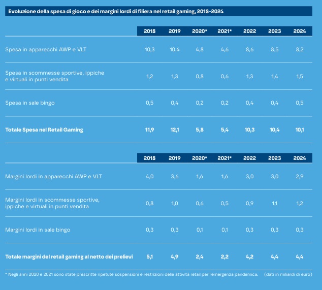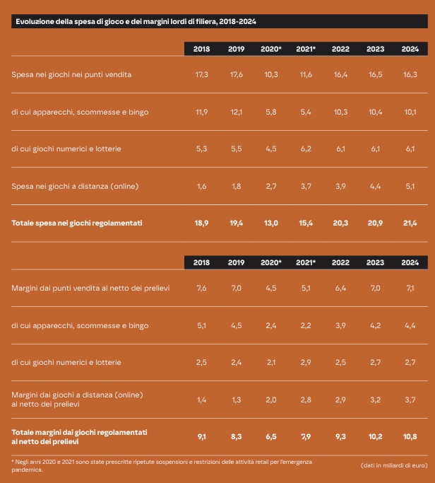 Nel confronto tra 2018 e 2024 la Spesa in apparecchi AWP e VLT ha una diminuzione del -20,4% pari a -2,1 miliardi di euro; la spesa in scommesse sportive, ippiche e virtuali in punti vendita ha un aumento del 25,0% equivalente a 0,3 miliardi di euro; la spesa in sale bingo resta invariata; la spesa per giochi numerici e lotterie ha un incremento del 15,1% pari a 0,8 miliardi; la spesa nei giochi a distanza (online) aumenta del 218,8% e vale 3,5 miliardi. Il totale della spesa nei giochi regolamentati aumenta del 13,2%, pari a 2,5 miliardi di euro.