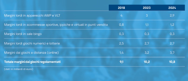 Nel periodo tra il 2018 e il 2024 il margine lordo per le AWP e le VLT diminuisce di 1,1 miliardi di euro, cioè del 27,5%. Per le Sale Bingo restano invariati. Le scommesse sportive, ippiche e virtuali in punti vendita aumentano di 400 milioni di euro, +50%. I giochi a distanza (online) hanno un incremento di 2,3 miliardi di euro, pari a +164,3%. Il totale dei margini nei giochi regolamentati aumenta del 18,7%, pari a 1,7 miliardi di euro.