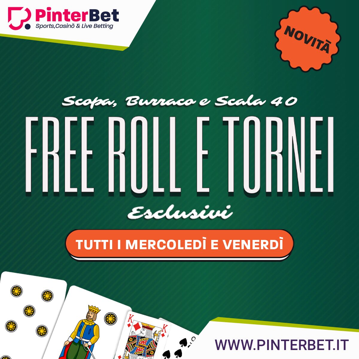 Ecco i tornei di carte dedicati ai clienti di PinterBet. Freeroll e Garantiti per divertisti con: Scopa, Burraco e Scala 40.
