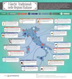 In Italia la componente del gioco online su dispositivo mobile sta prendendo sempre più piede, con un aumento della spesa sui canali smartphone e tablet del 145% nel 2013 anche se i giochi tradizionali sembrano reggere la sfida contro le più moderne tecnologie. In questo scenario Lottomatica.it ha sviluppato uno studio sul mercato del gioco online in Italia, ai giochi di una volta, individuando i giochi tradizionali di ogni regione. Con un’apposita infografica, Lottomatica individua infatti per ciascuna regione i giochi tradizionali che caratterizzano il territorio, suddividendoli in sei categorie: giochi con il cibo, di strada, popolari, con le pietre, da tavola e con il bastone. Fra i giochi con le pietre spiccano il Ciottolo, tipico delle Marche, e il pugliese Gioco delle 5 pietre, articolato in 9 fasi da compiere in sequenza senza mai sbagliare. Giochi col bastone come la Lippa e i Cerchietti mettono in contatto le regioni estreme dell’Italia: rispettivamente la Basilicata e il Trentino. Immancabili alle feste popolari di paese sono invece la Corsa nel sacco, i Carrioli, il Gioco del ferro, oppure giochi con il cibo come Pignatte e Ciuccetta. Completano l’infografica i giochi da tavolo come il Gioco dell’oca in Toscana e i giochi di strada come il veneto Borella. Per quanto riguarda il gioco online, dall’indagine del Dipartimento di Ingegneria Gestionale del MIP è emerso come il mercato italiano sia costituito per circa il 90% da tre categorie di gioco: le scommesse sportive, preferite dagli scommettitori del Sud (Abruzzo, Basilicata, Campania, Molise, Puglia, Calabria); il poker, maggiormente giocato nelle Marche, in Sardegna, Toscana e Val d’Aosta; i giochi da casinò, prediletti dai giocatori di Emilia Romagna, Friuli, Lazio, Liguria, Lombardia, Piemonte, Sicilia, Trentino, Umbria e Veneto. Poichè il gioco, tanto più quello tradizionale, viene comunemente considerato un aspetto importante per la socializzazione dei bambini, bisogna riconoscere che in Italia è in atto un processo di recupero, da parte di tutte le generazioni, delle attività ludiche tradizionali in quanto occasioni di crescita sociale e culturale. Ecco l’infografica realizzata da Lottomatica sui giochi della tradizione italiana:
