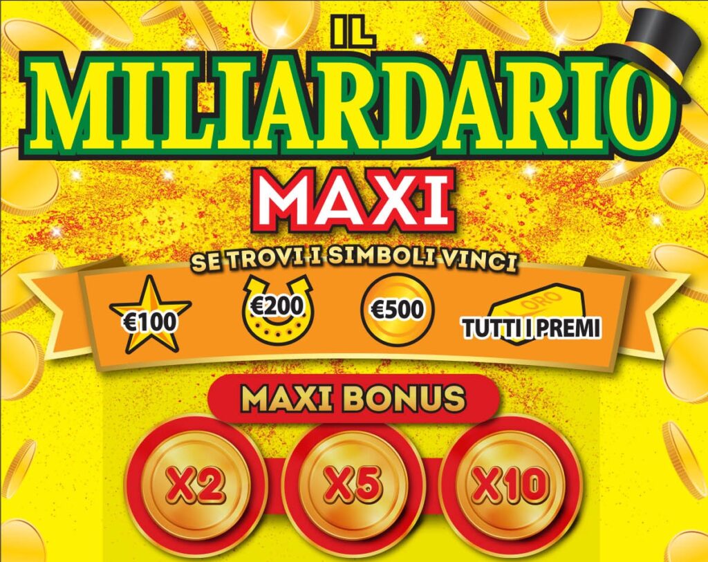 Nel tagliando “Il Miliardario Maxi” è prevista una opzione di vincita denominata “Maxi Bonus“. Si tratta di 3 numeri identificati con “X2”, “X5” e “X10”. In pratica se uno di questi tre numeri è presente nell’area “I tuoi numeri” si moltiplica la cifra trovata per 2, 5 o 10 volte.