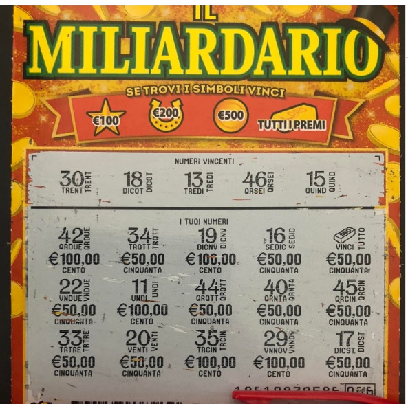 Ebbene, nella rivendita Tabacchi 20 di Danilo Monteleone, un fortunato giocatore ha grattato un tagliando ‘Il Miliardario‘, trovando, tra ‘I tuoi Numeri’ il lingotto d’oro. Questo simbolo permette di portarsi a casa tutti i premi del tagliando.
