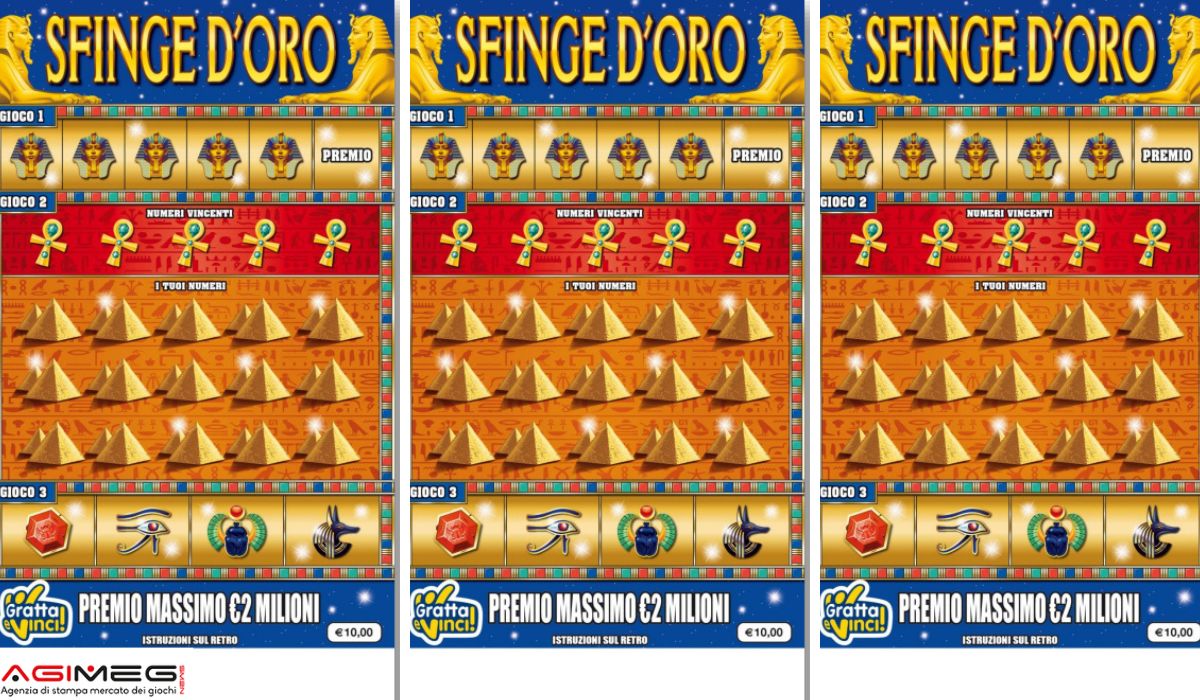 Sfinge d’oro è un biglietto Gratta e Vinci da 10 euro con premio massimo da 2.000.000 euro. Il biglietto presenta tre diversi giochi ognuno caratterizzato da una specifica meccanica.