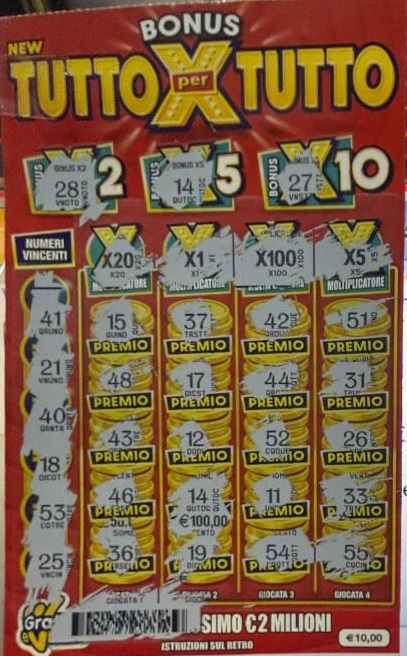 In questa tabaccheria si susseguono infatti da tempo una bella serie di successi con vari tagliandi del Gratta e Vinci. Protagonista di una bella vincita recente è stato il tagliando “New Bonus Tutto x Tutto“, Gratta e Vinci dal costo di 10 euro.