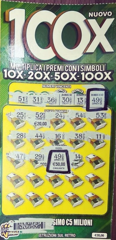Ed il fortunato cliente del Bar Pasticceria Tabacchi Tucci grattando nell’area “i tuoi numeri” ha trovato il 49, numero che era presente anche “Bonus X10“. Il premio che avrebbe quindi trovato sotto il 49 sarebbe stato moltiplicato per 10 volte. Avendo trovato sotto il numero vincente 50 euro, il giocatore si è portato a casa la bella vincita di 500 euro.
