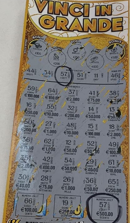 Grattando nell’area “numeri vincenti” il giocatore ha trovato il 57. Ebbene questo numero era presenta anche sotto la casella “numero jolly €500″ e quindi il fortunato cliente ha potuto subito incassare la bella vincita di 500 euro.