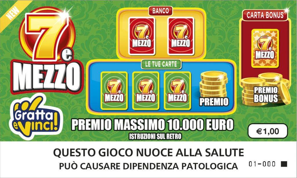 Il Gratta e Vinci ‘Super 7 e mezzo‘ è un tagliando dal costo di 3 euro, che consente una vincita massima di 200.000 euro. Il regolamento di gioco prevede che se la somma de “Le tue carte” supera quella del “Banco” e non fa più di 7 e mezzo, si vince il premio corrispondente. Se una delle “Carte Bonus” è uguale a una de “Le tue carte” si vince il “Premio Bonus“.