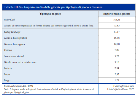 “In particolare, a fronte di un maggiore impegno economico rispetto ad altre tipologie di gioco, il “Poker cash” registra per sua natura un importo più elevato e pari a 164,91 euro in media a giocata. Il “Bingo” invece registra l’importo più basso e pari in media a 1,29 euro”, si legge in riferimento agli importi medi per giocata delle diverse tipologie di gioco a distanza.