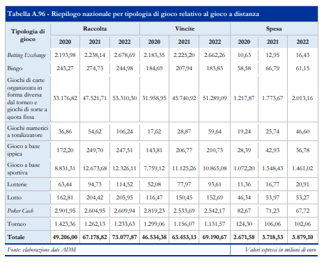 La Raccolta del gioco a distanza ha registrato una crescita pari all’8,78 per cento, dovuta in particolare ad un incremento del 94,53 per cento per i “Giochi numerici a totalizzatore”, del 20,89 per cento per le “Lotterie” e del 19,68 per cento per il “Betting Exchange”.