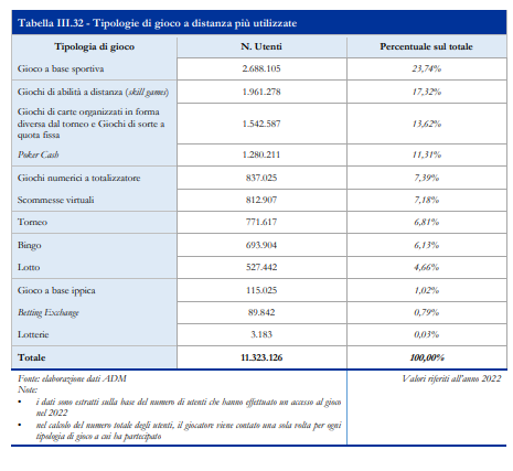 “Il 23,74 per cento degli utenti del gioco online ha manifestato maggior interesse per il “Gioco a base sportiva”, seguito dal 17,32 per cento della platea che si è rivolto ai “Giochi di abilità a distanza (skill games)”. Il 13,62% degli utenti ha invece scelto i “Giochi di carte organizzati in forma diversa dal torneo e Giochi di sorte a quota fissa”.