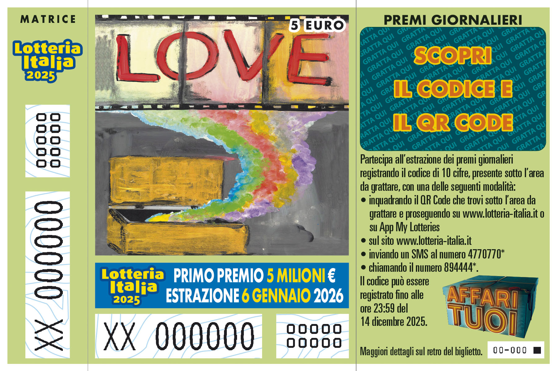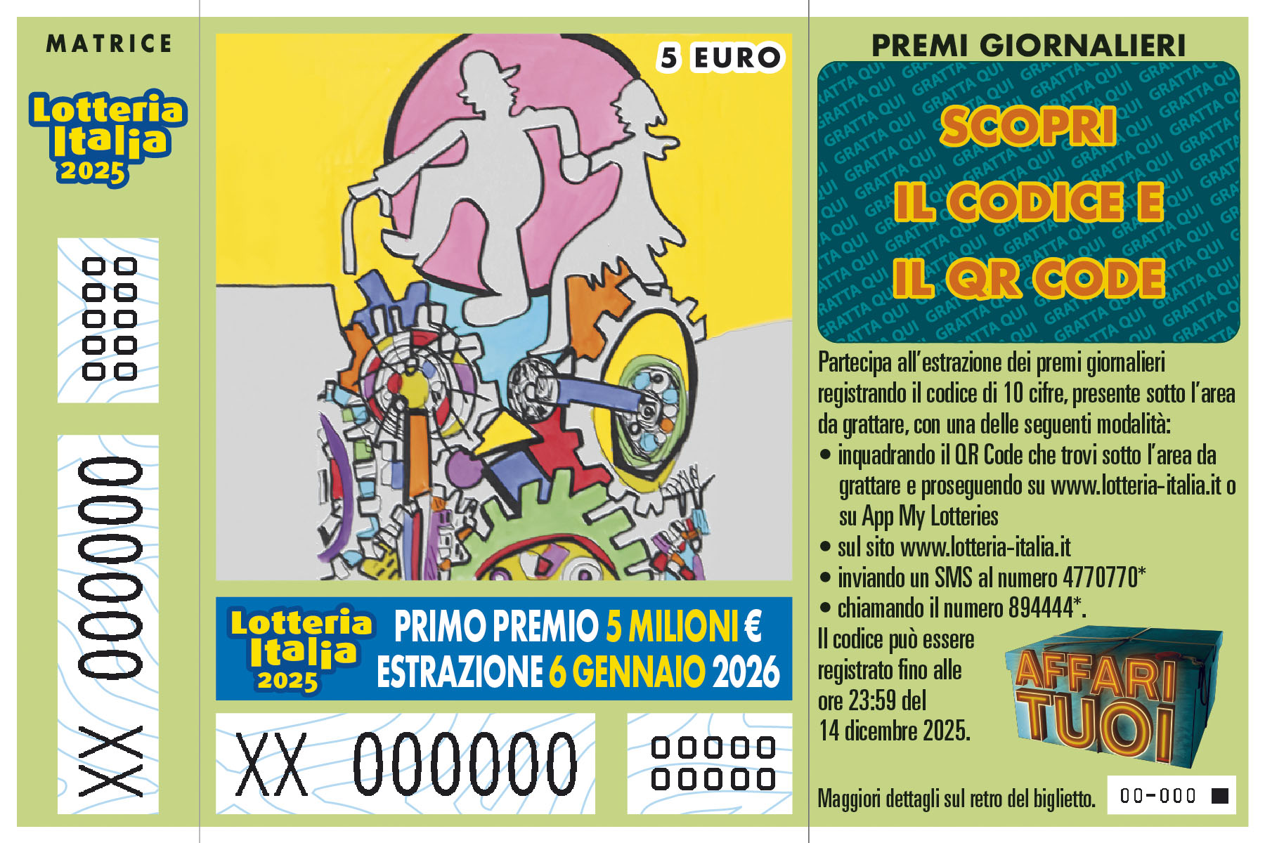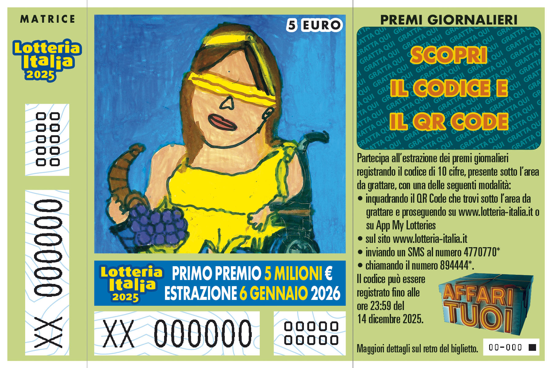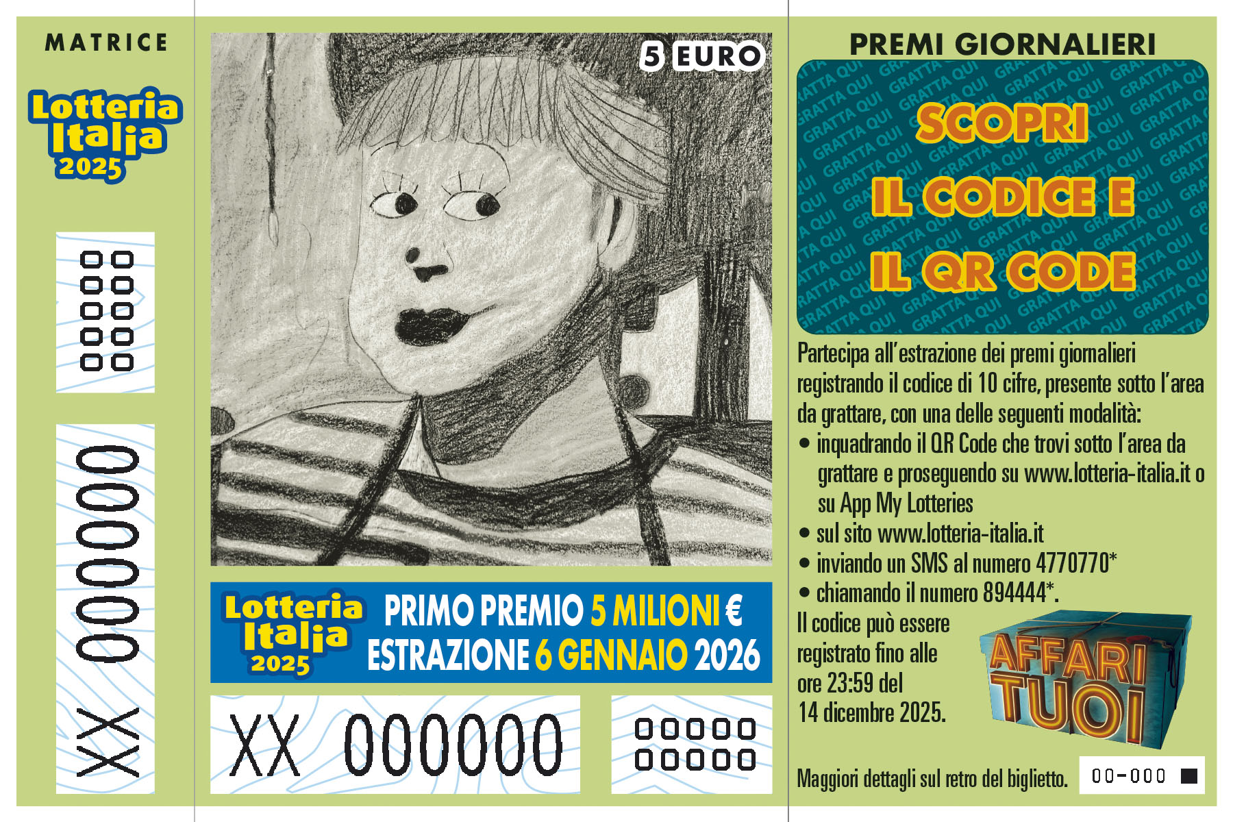 Il biglietto della “Lotteria Italia” – manifestazione 2025 è prodotto in dodici rappresentazioni grafiche. I layout dei biglietti sono visionabili sui siti www.adm.gov.it e www.lotteria-italia.it . Il prezzo di vendita al pubblico di un biglietto è di euro 5,00. I biglietti sono prodotti in forma cartacea o in modalità digitale. Con il medesimo biglietto della “Lotteria Italia”, si concorre all’assegnazione dei premi, anche di carattere speciale, attribuiti con l’estrazione finale e all’assegnazione di premi giornalieri la cui partecipazione è prevista attraverso un codice di 10 cifre riportato in caratteri numerici o in forma di QR code, inserito in un tagliando allegato al biglietto. In fase di prima applicazione sono prodotti 11.000.000 di biglietti.