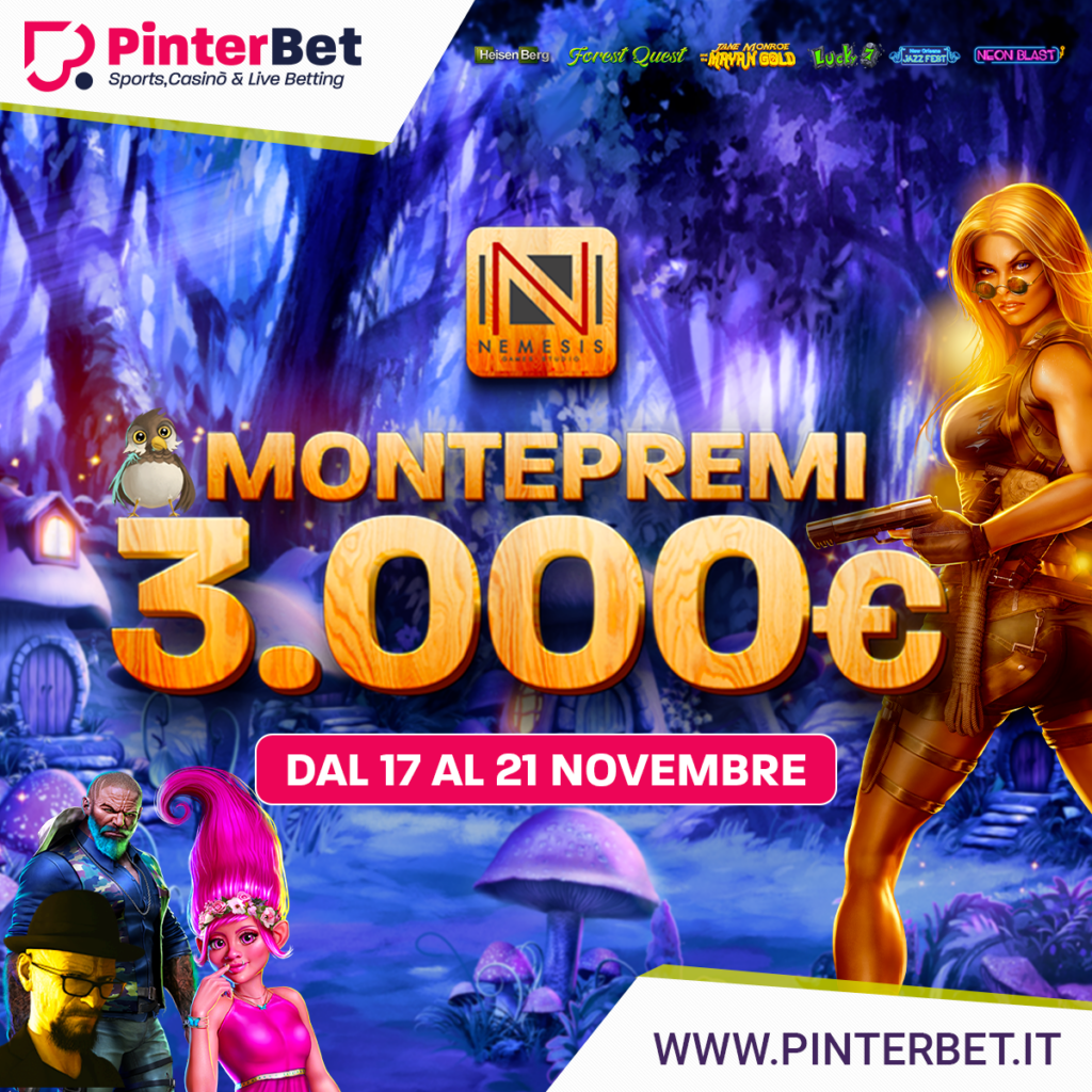 Sei giochi, 3mila euro in palio, 5 giorni per entrare in classifica. Ecco i numeri vincenti della nuova classifica di PinterBet offerta in partnership con Nemesis. Già visibile sul sito di gaming on line la “Nemesis Race” si preannuncia il torneo più divertente del week end.