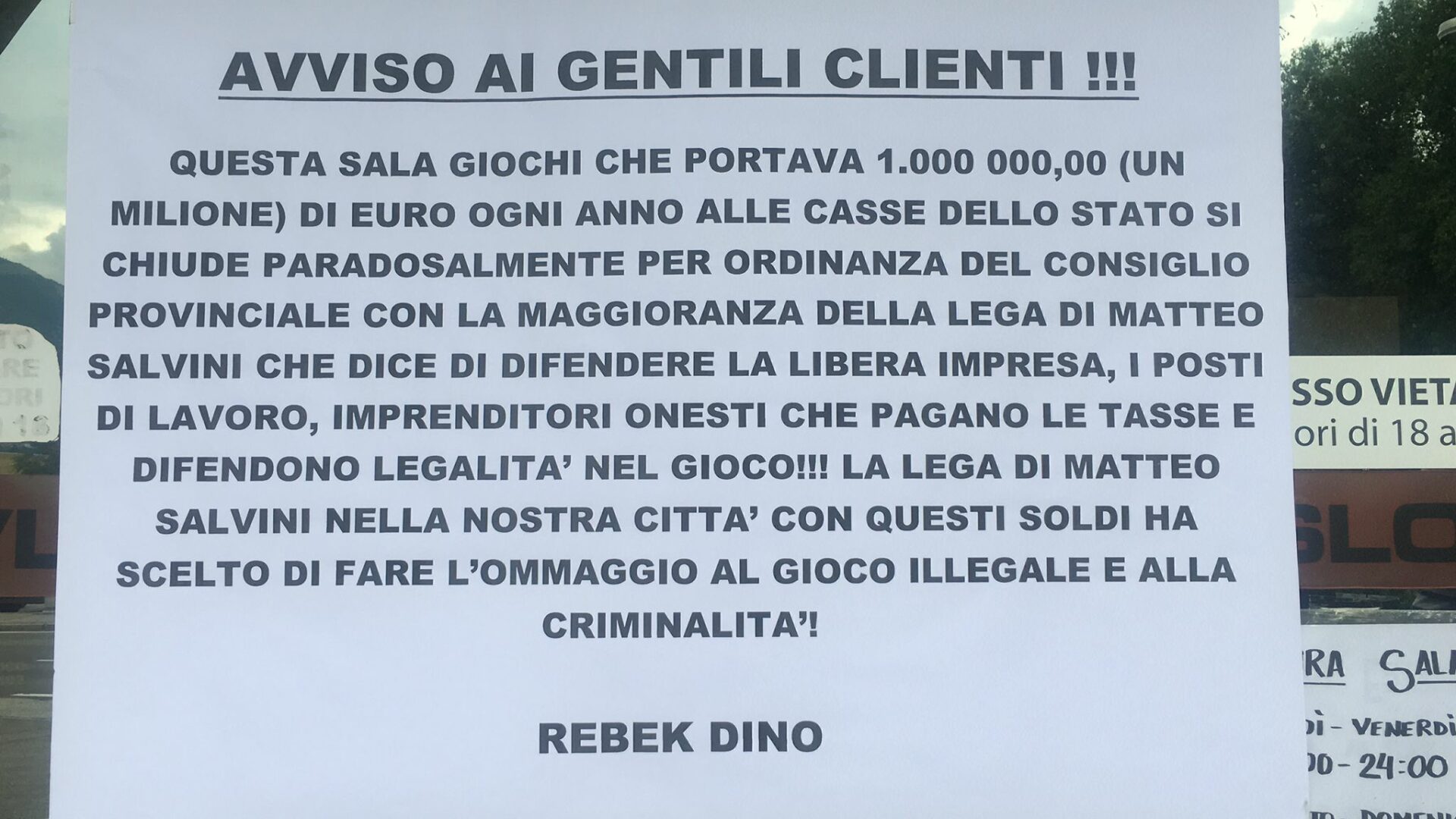 “Questa sala giochi che portava 1 milione di euro ogni anno alle casse dello Stato chiude, paradossalmente per ordinanza del Consiglio Provinciale (di Trento, ndr) con la maggioranza della Lega di Matteo Salvini che dice di difendere la libera impresa, i posti di lavoro, imprenditori onesti che pagano le tasse e difendono legalità nel gioco.