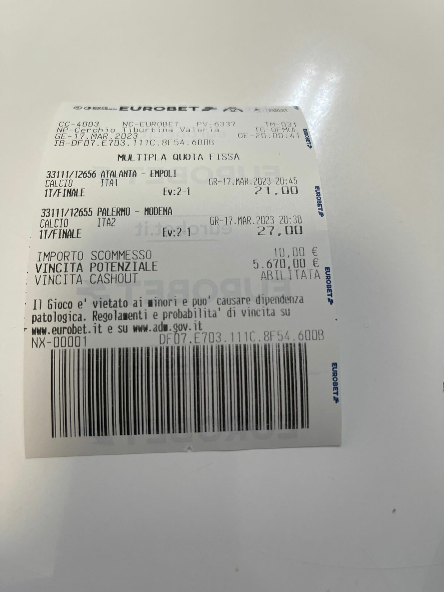 La vincita ha davvero del clamoroso. Lo scommettitore aveva scelto due partite e precisamente Atalanta-Empoli di Serie A e Palermo-Modena di Serie B.