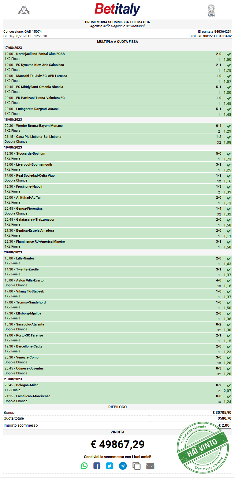Con il pronostico di 1X tra le due formazioni lusitane si chiudeva una scommessa da ben trenta avvenimenti che copriva cinque giorni di palinsesto per una quota totale superiore a novemilacinquecento volte la puntata iniziale.