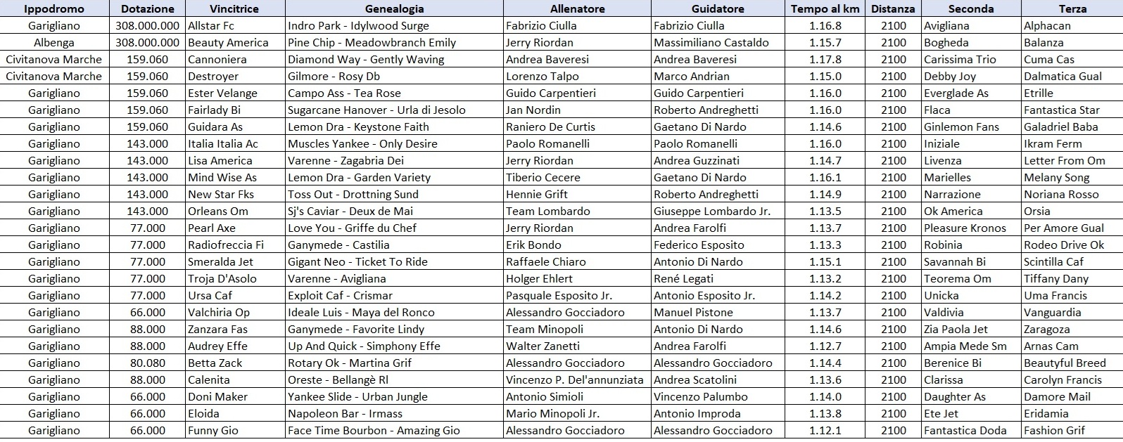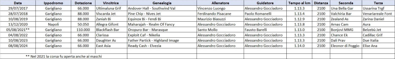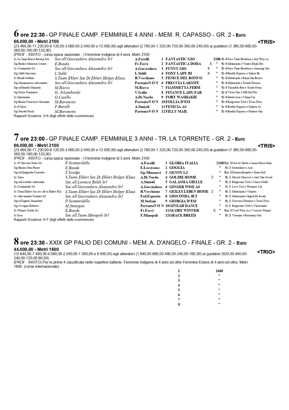 Dal 2017, proprio anche per dare una continuità al percorso delle femmine laureate l’anno prima, è stato istituito anche il Campionato Femminile delle 4 anni. Molte delle piazzate nella stagione precedente si sono ripetute dopo il passaggio d’età a dimostrazione della capacità di selezione della corsa anche se finora l’unica che è riuscita a realizzare il “doppio” è stata East Asia. Quest’anno l’impresa è alla portata di Funny Gio, altra allieva di Alessandro Gocciadoro, vincitore da guidatore e allenatore delle utlime tre edizioni della corsa. La portacolori della scuderia Comiantale, dopo aver vinto lo scorso anno tra le più giovani, è infatti la netta favorita della prova riservata alle 4 anni.