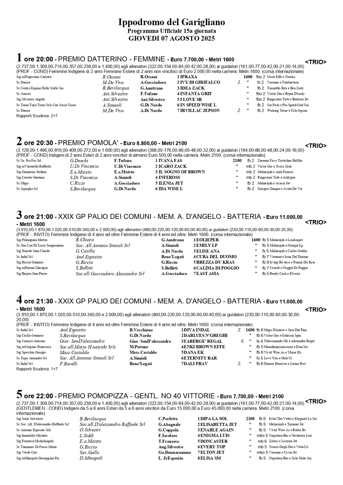 A completare una giornata tecnicamente di grandissimo livello, le due batterie e la finale del Palio dei Comuni – memorial Antonio D’Angelo (gr. 3 – 44.000 euro -1600 metri) anche queste riservate esclusivamente alle femmine ma di cinque anni e oltre. Due batterie da 7 concorrenti ciascuna con la finale, posta come ultima corsa del programma che vedrà in lizza le prime quattro classificate di ciascuna batteria. Si rivede in pista al Garigliano East Asia che ha l’occasione di ribadire ancora una volta la propria superiorità nella categoria oltre che il gradimento dell’anello pontino. East Asia sarà abbinata al Comune di Cassino, plurivincitore nell’albo d’oro della manifestazione.