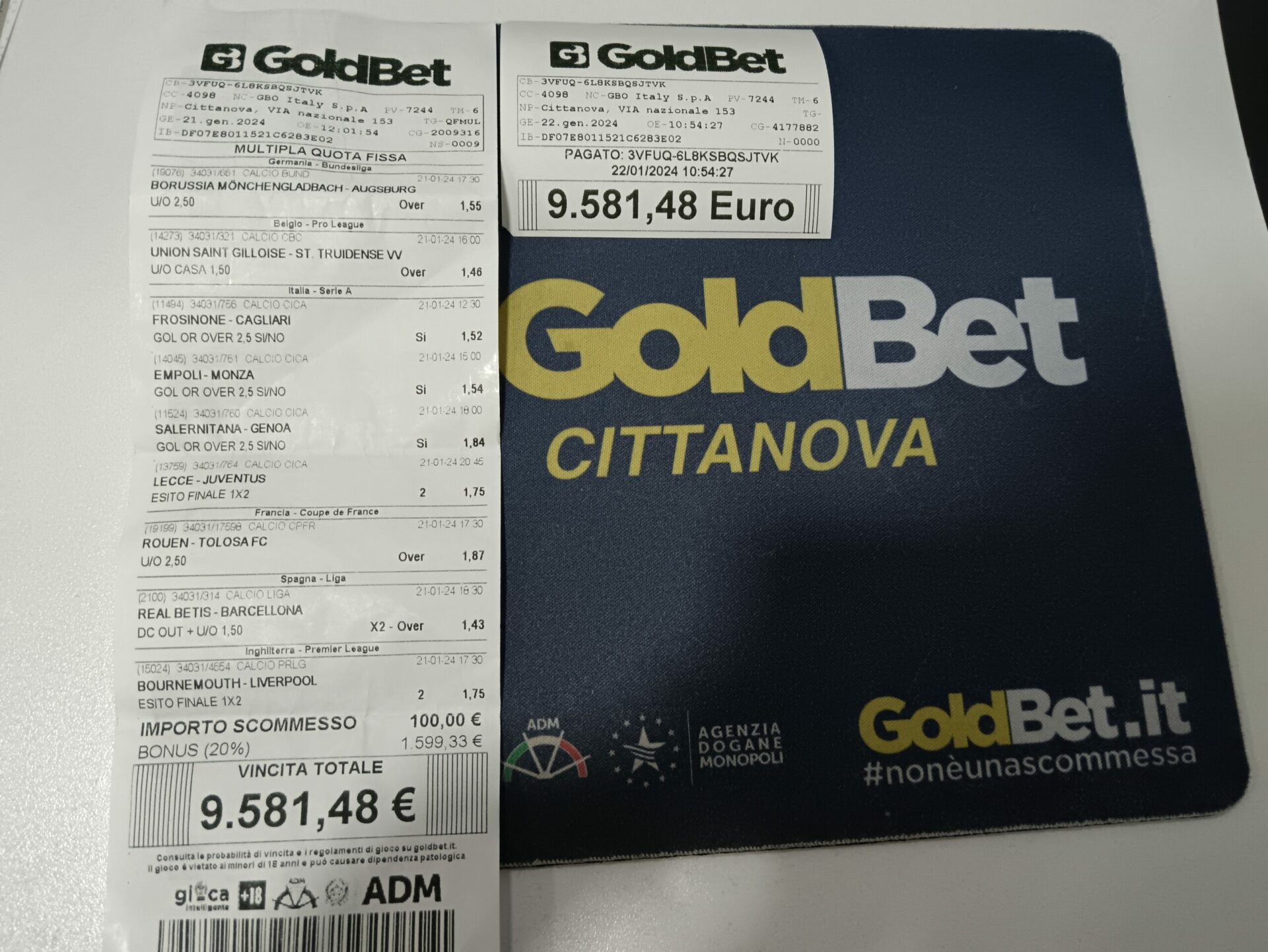 Fine settimana decisamente da ricordare per un cliente dell’agenzia Goldbet di Cittanova, in provincia di Reggio Calabria, che ha portato a casa una bella cifra puntando su ben 9 partite in giro per l’Europa.