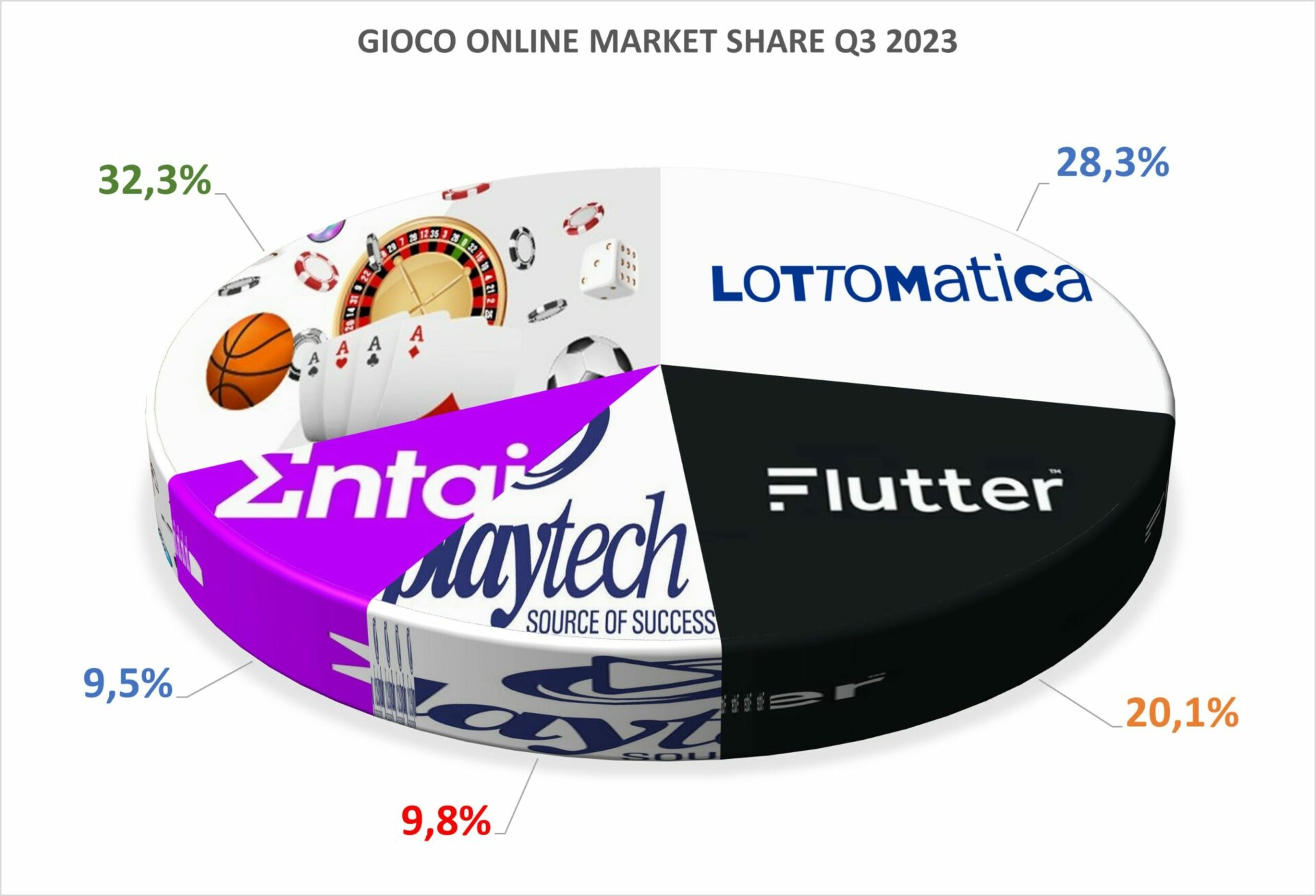 Per quanto riguarda invece il segmento delle scommesse sportive, sommando il valore dell’online e quello delle agenzie, nel terzo trimestre 2023 il market share di Lottomatica era del 25,7%, seguito da Playtech (16,4%), Flutter (14,8%) ed Entain (13,2%). Con l’acquisizione, il market share di Lottomatica sarebbe salito al 34,7%, visto il valore del 9% di Sks365.