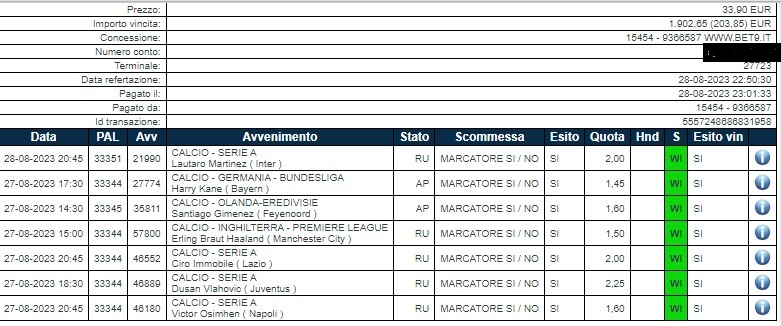 E la sua scelta è stata davvero particolare. Ha infatti deciso di puntare online su ben 7 marcatori scegliendo partite di Premier League, Bundesliga, Eredivisie e ben 4 incontri della Serie A.