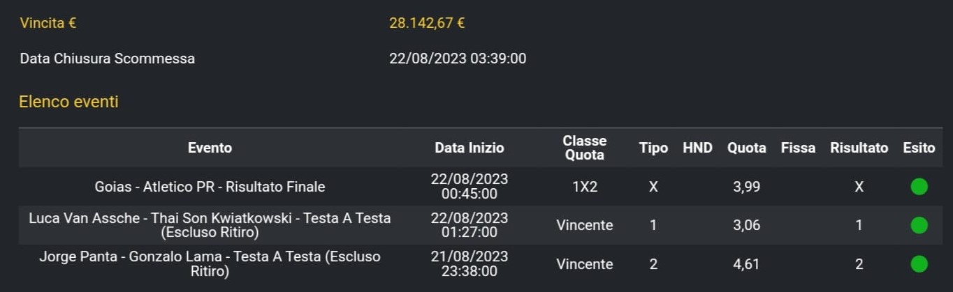 Per questi due incontri lo scommettitore ha puntato sul vincente dell’incontro che non era il favorito e quindi con quote elevate. Il terzo evento giocato ha invece riguardato il Campionato brasiliano di Serie A ed un pareggio che viaggiava che sfiorava il 4,00.