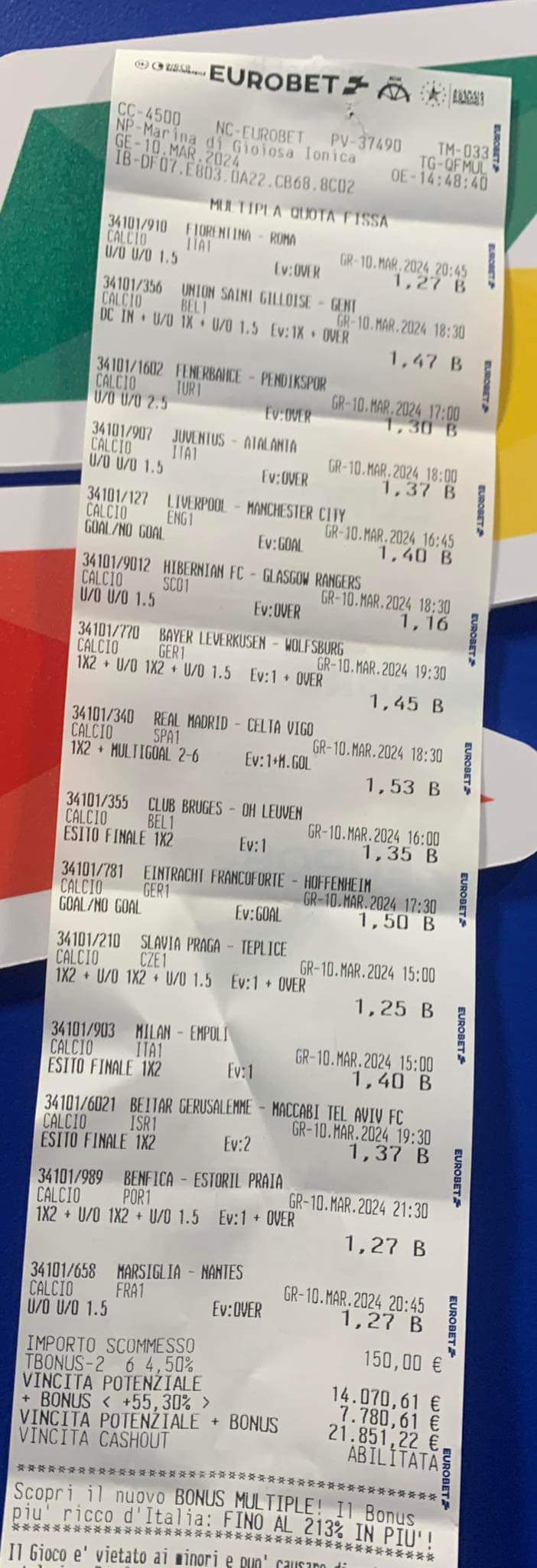 Questa volta, sono stati tre amici a mettersi insieme per una schedina multipla a quota fissa che comprendeva ben 15 partite dei campionati più disparati: non solo i classici Serie A, Bundesliga e Liga, ma anche partite di calcio in Belgio, Scozia e addirittura Israele.