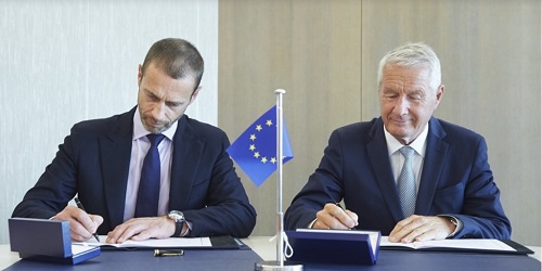 Il Consiglio d’Europa e la Uefa rafforzano la partnership per assicurare l’integrità nel calcio e il rispetto dei diritti umani nello sport. Thorbjørn Jagland e Aleksander Ceferin (rispettivamente segretario generale del Consiglio d’Europa e presidente della Uefa) hanno firmato questa mattina a Strasburgo un memorandum d’intesa per ampliare gli ambiti di cooperazione. L’accordo rafforza ulteriormente la cooperazione tra la UEFA e le autorità europee e consolida la rete di relazioni già avviate. La UEFA è la prima organizzazione sportiva a stipulare un accordo formale di collaborazione con il Consiglio d’Europa, un’organizzazione internazionale con 47 stati membri il cui obiettivo è sostenere i diritti umani, la democrazia e lo stato di diritto in Europa. “Grazie a questo accordo potremo salvaguardare in maniera più efficace i diritti umani” ha commentato Jagland in una nota. “Insieme al Consiglio d’Europa potremo diffondere ancora meglio i valori positivi che portano il calcio e lo sport in generale” ha aggiunto Ceferin. lp/AGIMEG