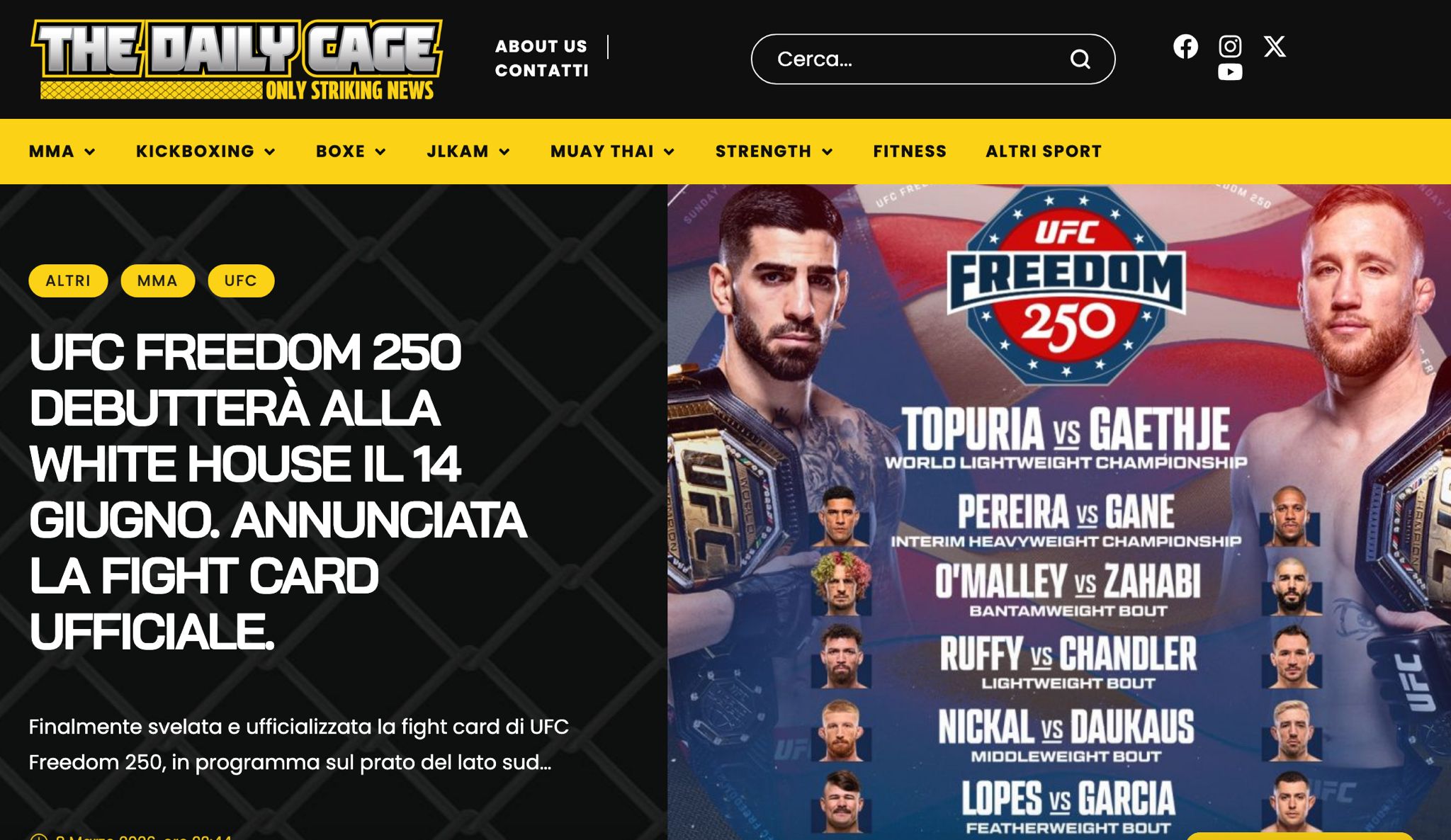 Si partirà con Diego Lopes (BRA) vs. Steve “Mean Machine” Garcia (USA) (featherweight), per poi proseguire con Bo Nickal (USA) vs. Daukaus (USA) (middleweight). Proprio quest’ultimo aveva ricevuto, nei giorni scorsi, una comunicazione di annullamento del suo match, in programma il prossimo 11 aprile 2026 (contro il brasiliano Vicente Luque) a Miami (in Florida). Una comunicazione che non aveva fornito, allo staff dell’atleta, le ragioni di questo improvviso e singolare annullamento. Nella realtà i vertici della UFC avevano già deciso di inserire Daukaus nel programma di “UFC Freedom 250″.