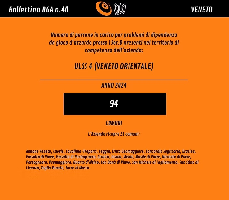 Nel quarantesimo Bollettino DGA ci sono i dati – relativi all’anno 2024 – forniti dall’Azienda Sanitaria ULSS 4 (Veneto Orientale) che comprende 21 comuni, tra i quali Jesolo, San Donà di Piave e Portogruaro. Sono 94 le persone in cura per la dipendenza da gioco. Si tratta dello 0,04% della popolazione residente nei comuni in questione.